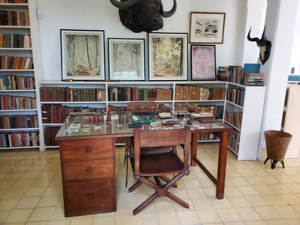 Eventually, we turned off the Carretera Central onto a smaller road that took us to the gates of a long driveway that gently slopes upward toward Hemingway’s main house and various smaller buildings, passing through sparse trees until reaching a parking lot. There’s a giftshop and a couple of support facilities for the estate, including a preservation and restoration lab opened in 2019 thanks to the ongoing joint Cuban-American effort to save the Finca Vigía from time and weather.