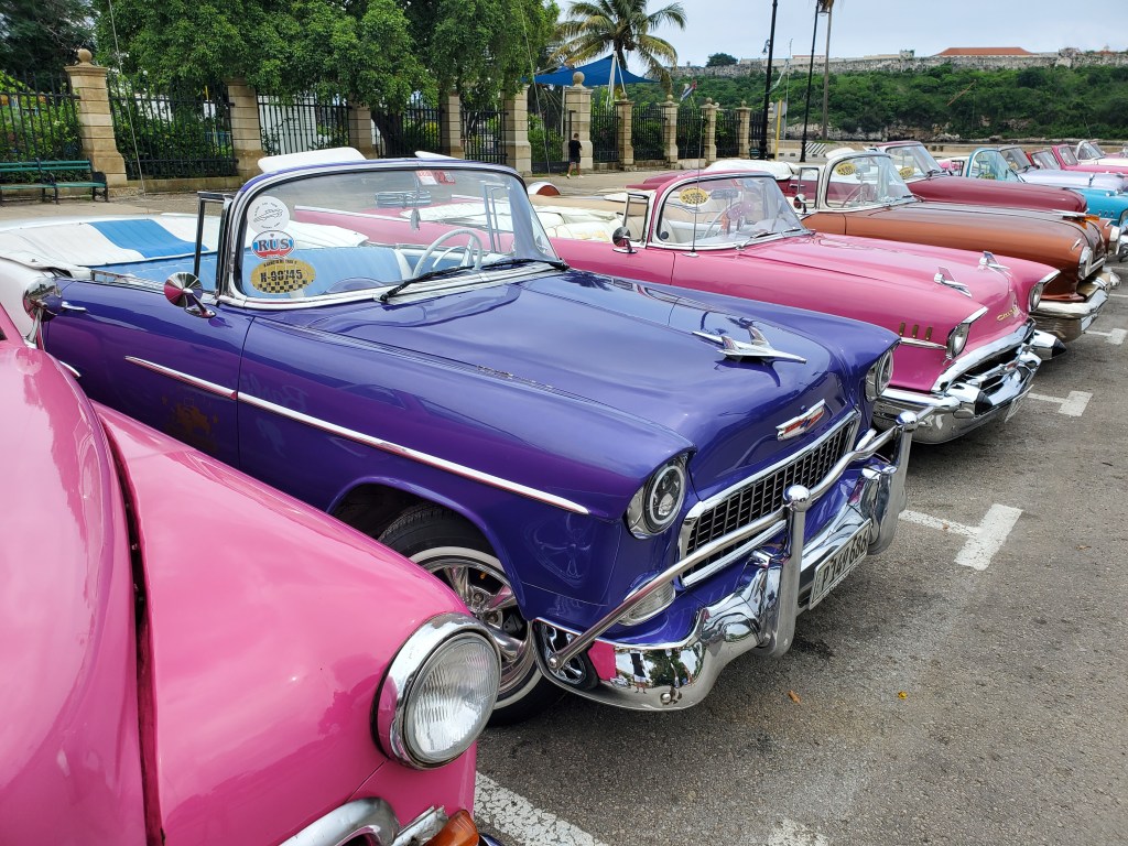 After an hour or so, we reboarded the bus to make our way to Havana proper, maybe a half-hour away. Traffic is not an issue in a place where few own cars. We did soon see the steel and chrome rainbow of colorful old American Chevys, Cadillacs, Fords, Pontiacs, etc., in Havana’s Plaza Central that are maintained as taxis. Up close, you can tell they’ve been repaired many times, and are said to have long ago replaced the original engines with whatever they can find that works. There are garages devoted to keeping these gorgeous classics operational, with fresh glass and upholstery, and they keep them beautiful – the paint jobs are a vivid delight. They’re not really classic American cars anymore but instead are extremely Cuban now. They’re a treasure literally and figuratively. Havana has out-Detroited Detroit.