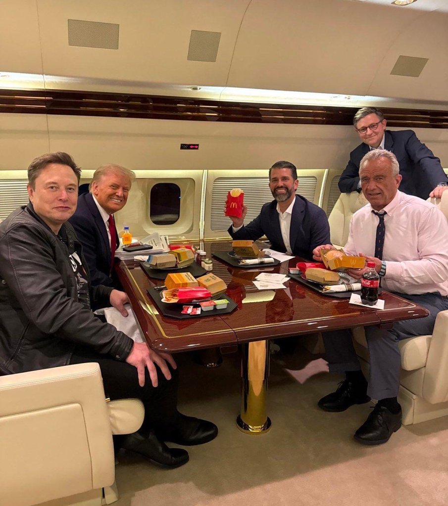 But that was just the warm-up. The rest of the weekend brought us a flurry of photos of the president-elect and his wretched cabal of weird supplicants and striving courtiers lording about doing strange shit. There was Trump and First Lady Elon Musk having a feast of McDonald’s on a plane with an especially taut-skinned Robert Kennedy Jr., in what clearly was a Stalinesque humiliation ritual — Bobby Kennedy’s buff and shiny son was put on display eating garbage fast food with a Coke, posed as a political trophy that Trump has added to his collection of conquests. Camelot, probably for the better, has fallen.