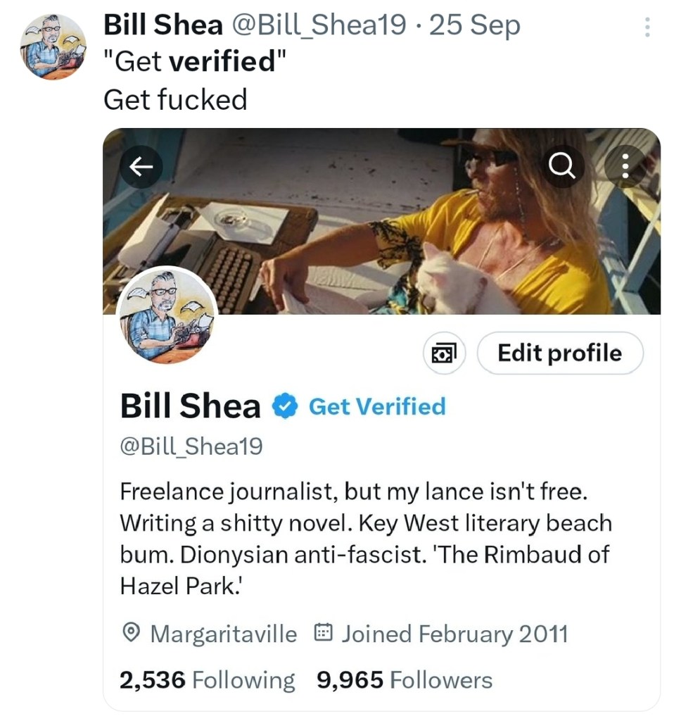 I put “verification” in quotes above because under the old regime, you actually had to fit particular criteria to have the little blue and white badge. It took me several years and something like a dozen tries to get verified, a stupid and frustrating misadventure — newsroom colleagues similar to me in online notoriety were being verified immediately, to my chagrin and exasperation, as were French porn accounts and minor government officials from the island of Malta. I’m not kidding.