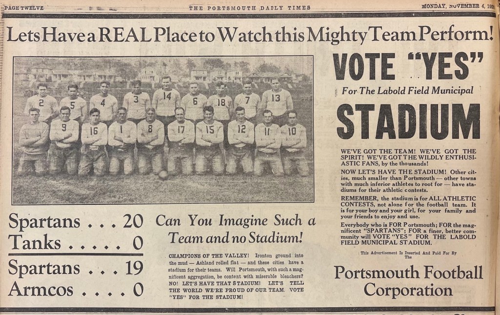 The owners of the independent pro or semi-pro Portsmouth Spartans campaigned for a public funding for a new stadium in 1929, and they got it. That led the NFL to grant the city a franchise, one that relocated to Detroit in 1934 to become the Lions. (Scioto Historical)