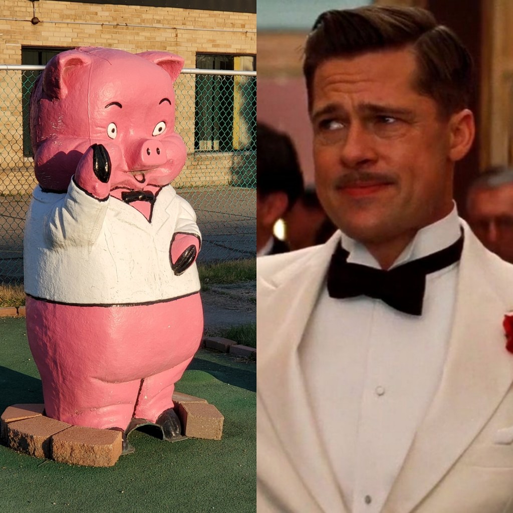 Bawnjorno! The white tuxedo-wearing pig at the mini-golf near me looks like Brad Pitt’s Lt. Aldo Raine from “Inglourious Basterds.” Brad Putt?
