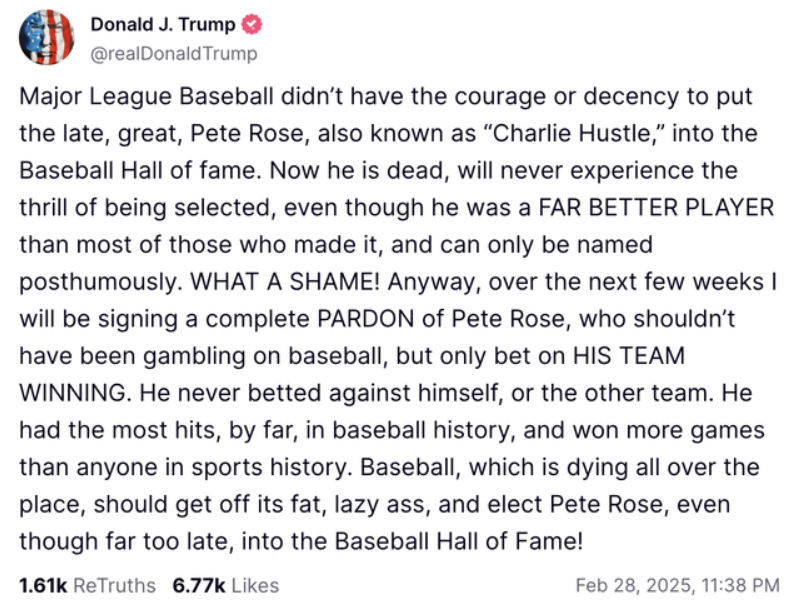 Rose’s accomplishments have long been in Cooperstown and in baseball’s record books. There’s a display in the hall of his photo and other ephemera related to setting the career hits record. What Rose does not have is an induction plaque that signifies personal enshrinement. He didn’t get the ceremony and adulation that he craved but sabotaged in his lifetime. Thanks to Manfred currying favor with MAGA yokels and their dipshit sovereign, that could now happen post-mortem if the hall’s Veterans Committee opts to vote him in. Whether they do or not, we’ll see. Trump surely will continue to apply pressure on this issue vital to our national interests.
