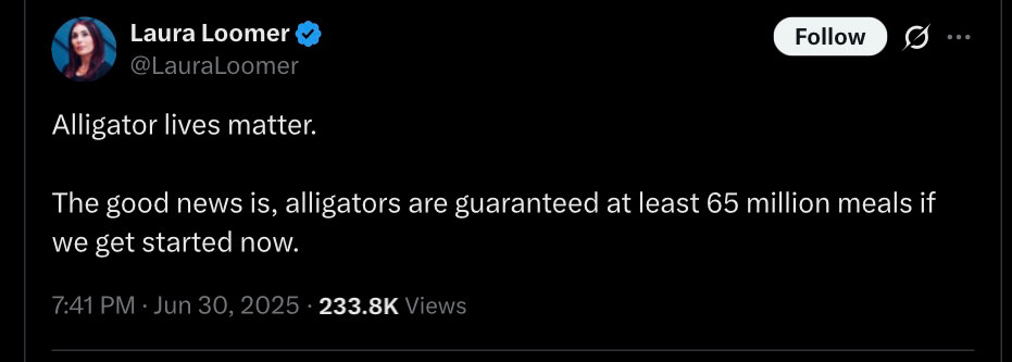 Trump is a rapist, multiple felon, and grifter but mainly a lazy sadistic degenerate who has lost all credibility and all moral authority to remain in his role. Imagine the apoplectic orgasmic fit Fox News would experience for weeks or months if Barack Obama waxed about his idle fantasy of alligators eating domestic political prisoners.