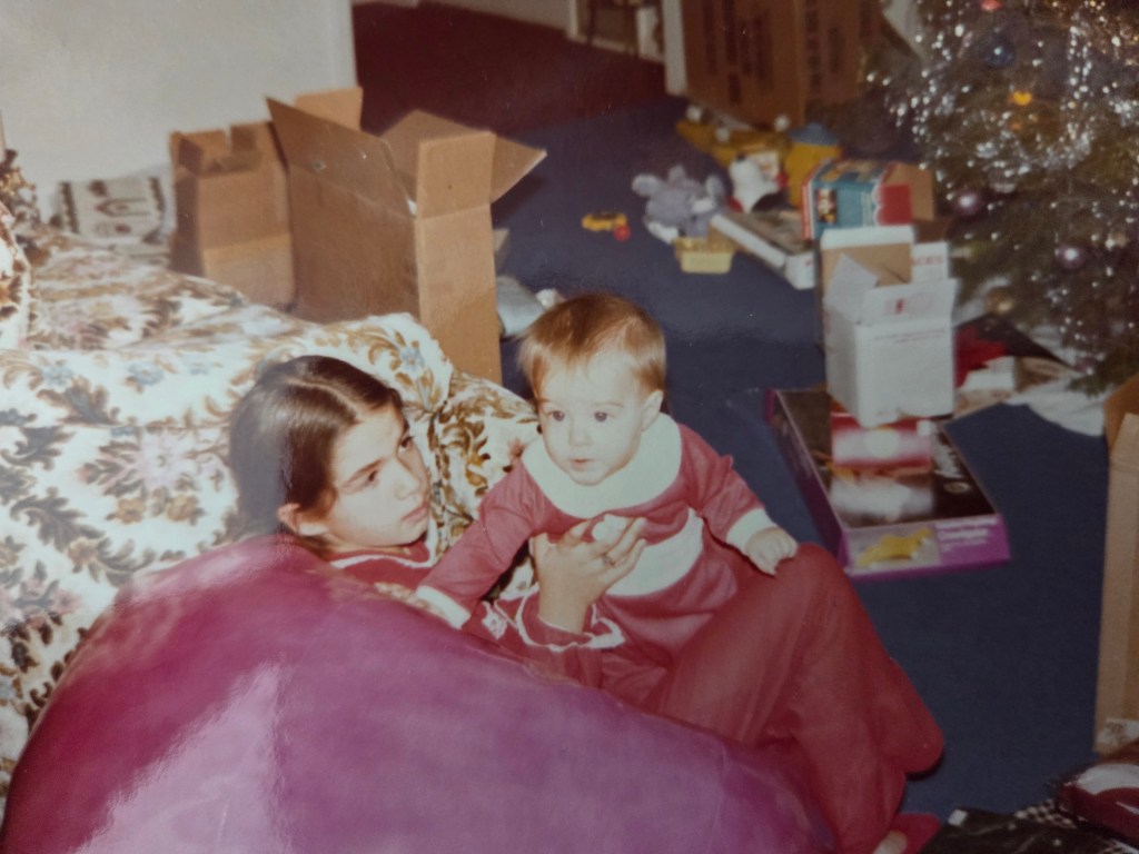 My sister Lysa, age 10, holding me at Christmas 1975 in our Bay Village, Ohio, home.