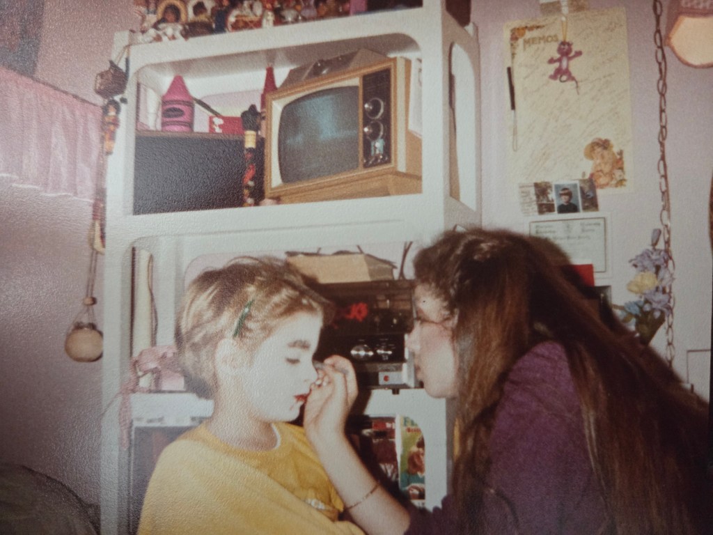 Lysa doing my Count Dracula makeup for Halloween in the early ’80s. The stereo behind me is the one she’d let me listen to the NPR “Star Wars” radio program. Her room was a vast delight of colorful stuff to me.