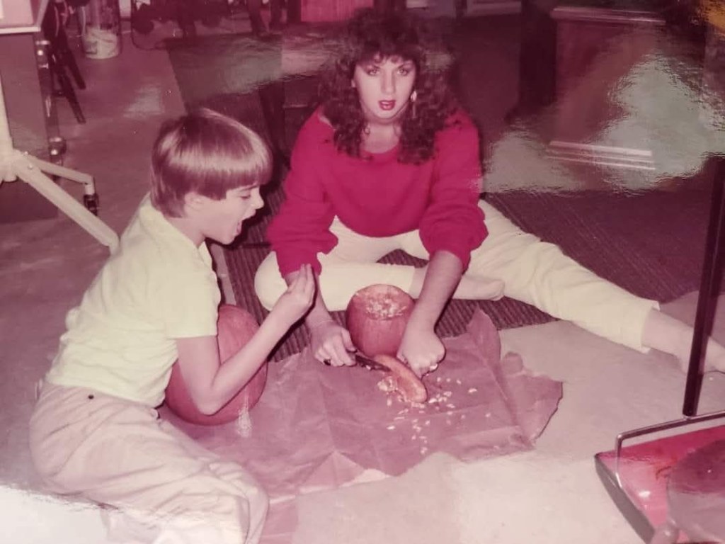 Lysa and me carving pumpkins a for Halloween in the basement of our house in suburban Pittsburgh, probably 1984.