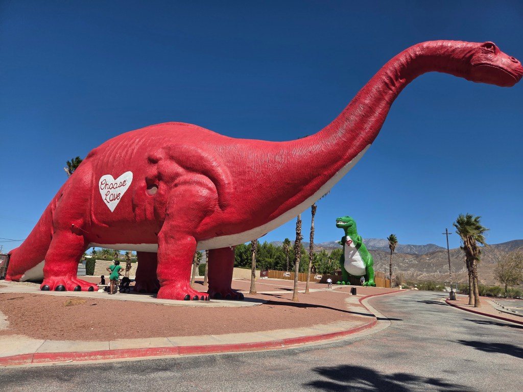 We stopped in Cabazon on the approach to L.A. to visit the big dinosaurs made famous by “Pee Wee’s Big Adventure” – which is finally getting a Criterion Collection edition. I had no idea there was a gift shop in the larger dinosaur. RIP, Large Marge.