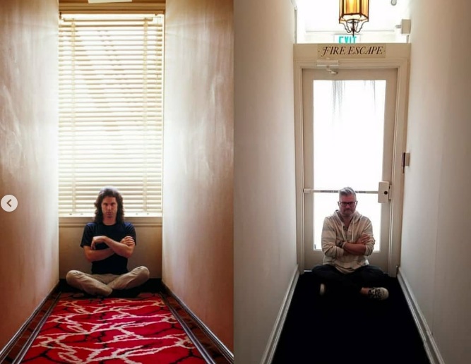 Jim Morrison and the rest of The Doors were photographed by Art Kane for Life magazine in 1968 at the hotel and Morrison may or may not have dangled from a window and broken a bone there. Below is Morrison on the left (obviously) in a Chateau Marmont hallway, and me in 2019 in one of the hotel’s other halls.